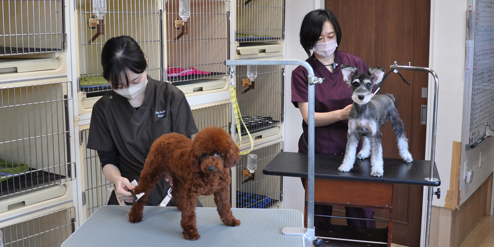2人の女性トリマーがトリミングをしている為、1日にできる頭数は限られていますが、完全予約制にしていますので、1頭・1頭丁寧にトリミングさせて頂いております。